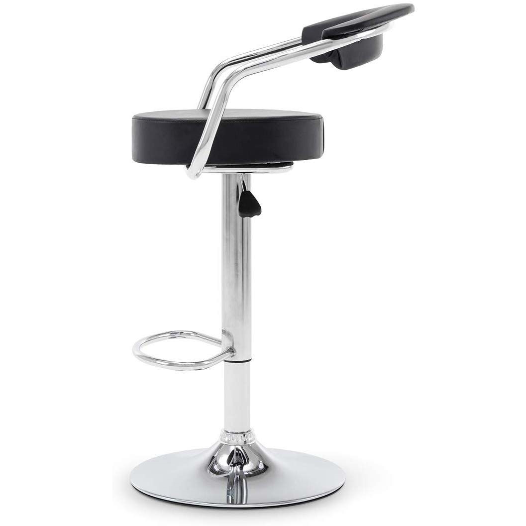 Add a modern and chic touch to any room or entertainment space with this Set of 2 eye-catching swivel barstools. Black Faux Leather Round Seat. Each barstool has a Chrome Footrest.
