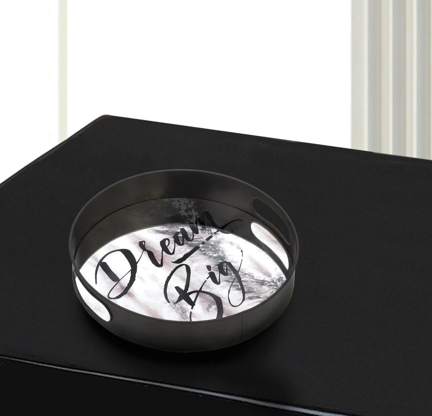 A beautiful display for your smaller items, the Positano “Dream Big” Round Mirror Tray features a gorgeous antique wash background and black cursive text that will add inspiration to your décor. ||Round tray with side handles. Black cursive writing.