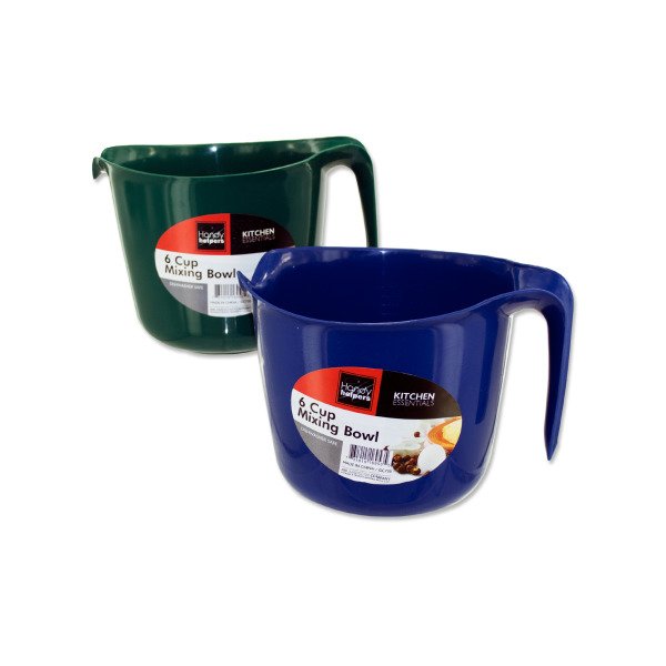 The mixing bowl is ideal for whipping up batters, combining ingredients or even storing prepped foods for later use. Bowl can hold up to six cups, has a handle for hold and an easy pour spout. Colors are assorted and can include blue or green. Bowls are packaged loose with an artwork label.