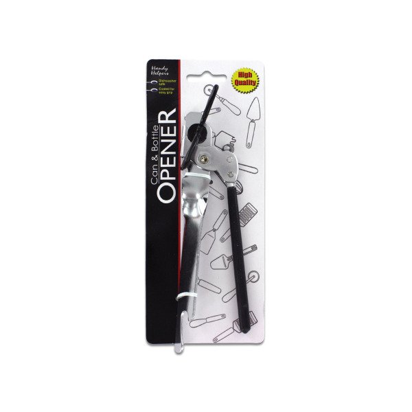 This manually operated can opener is great for both cans and bottles. Has a rubber coated handle and turner for a comfortable easy grip. This is kitchen essential! Dishwasher safe. Comes on a tie card with hanging hole. Measures 6 1/2" long with a 2 1/4" turner.