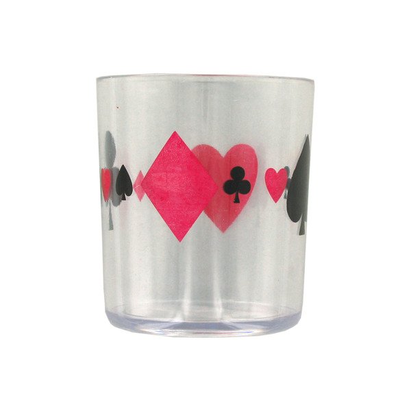 This plastic tumbler comes in a poker design which is perfect for game nights or Las Vegas themed parties. Tumbler is clear with hearts, diamonds, clovers and spades all the way around in alternating red and black. Each tumbler can hold up to 16 ounces. Hand washable for reuse. Tumblers measure 5 3/4" x 4 1/4"