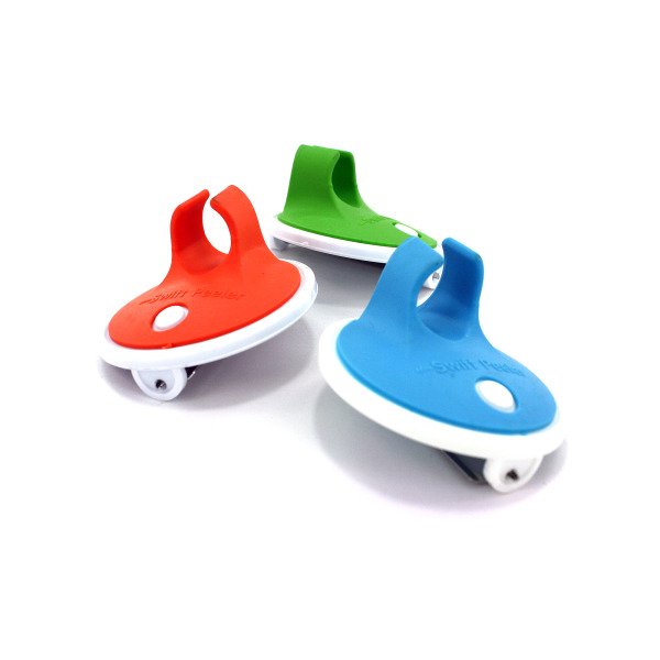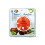 This uniquely designed vegetable peeler is quick, efficient and has a soft rubber grip. Slide finger into grip, wrap palm around peeler and use! Great on apples, carrots, potatoes and more. Rubber colors include orange, blue and green. Comes packaged in a clam shell with hanging hole. Measurements: 2 1/2" in diameter, 2" double blades and 3/4" finger slide.