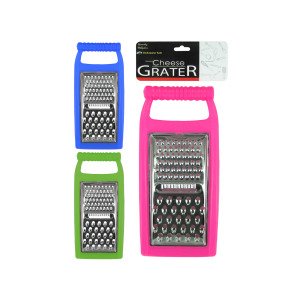 Cheese graters are a multi-purpose kitchen tool! Great for cheese, chocolate, carrots, potatoes and more! Has a comfortable handle with ridges for easy grip. The grate area has three different sizes for various shapes or sizes. Colors include: pink, blue, orange, white and green. Comes packaged in a poly bag with header card. Each grater measures 10" x 4 3/4".