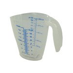 Measuring cups are a kitchen essential. Ideal for baking, cooking or other measuring needs. Each cup can hold 16 ounces (2 cups) of liquid. Cup has measurement increments that include: liter, milliliter, cups and ounces. Has an indented handle, pouring spout and is transparent for easy viewing. Comes packaged loose with UPC label on the bottom. Measures 5" tall and has a 3 1/4" 4 1/2" opening.