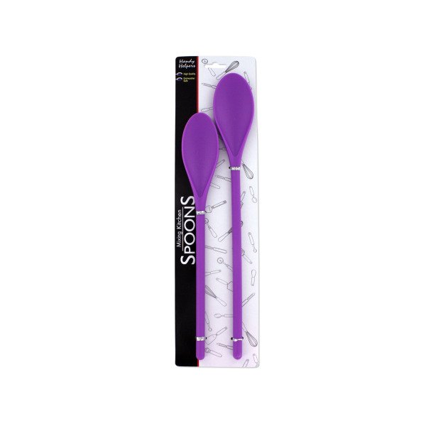 Plastic mixing spoons are a great addition to any kitchen! Use for mixing, stirring and more. Each set comes with 2 different length purple or white mixing spoons. Set comes packaged on a tie card with hanging hole. Spoons measures 11 3/4" and 13 1/2".