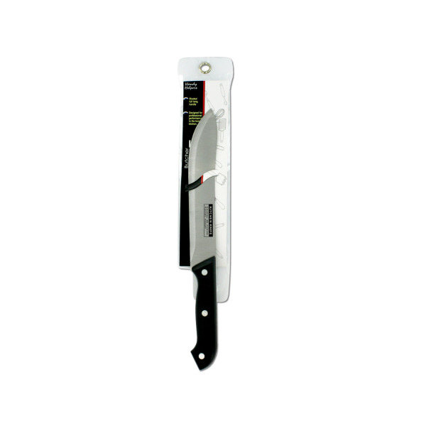Butcher knives are a chef's best friend. Made to cut through whole roasts and other large cuts of meat. Knife has a riveted full tang handle. Comes packaged in a PVC bag with metal hanging hole. Measures 12" from handle to tip with a 1 1/4" x 7 1/4" blade.
