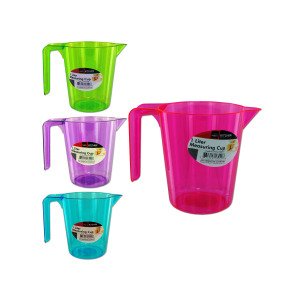 Liter measuring cups are a kitchen must-have! Use for baking, cooking and other measuring needs. There are both cup and milliliter markers. Each cup is made of sturdy plastic, has a long handle and an easy pour spout. Measuring cups come in assorted transparent colors which can include magenta, blue, green and purple. Measures 5 3/4" tall.