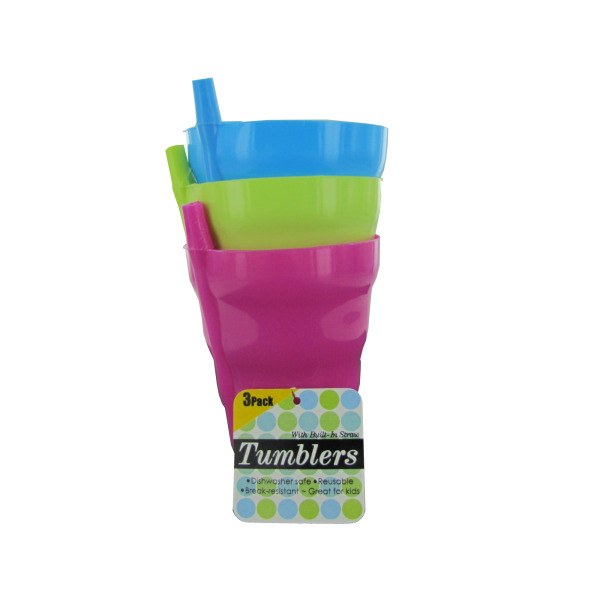 These colorful plastic tumblers are ideal for kids. Each comes with a built-in straw, reducing the chance that kids will spill their drinks in the house. Set includes one of each color -- yellow, blue and magenta. Small cups hold 8 ounces and are dishwasher safe.