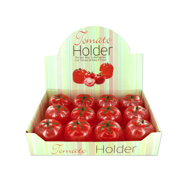 The tomato holder is the best way to refrigerate and keep cut tomatoes fresh. Each holder has a fun tomato shape and snaps tight to keep air out. Holders are made of sturdy plastic. There are 12 tomato holders per display. Holders are shrink wrapped with a UPC label on the bottom. Tomatoes measure 3 1/2 tall with a diameter of 3 3/4".