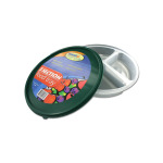 This three section food tray is tight sealing to seal in freshness and is microwaveable. There are three sections that make up the entire container. Two sections take up 1/4 of the container and one that takes up 1/2 of the container. It is circular and is 9" across and 1 1/2" tall.