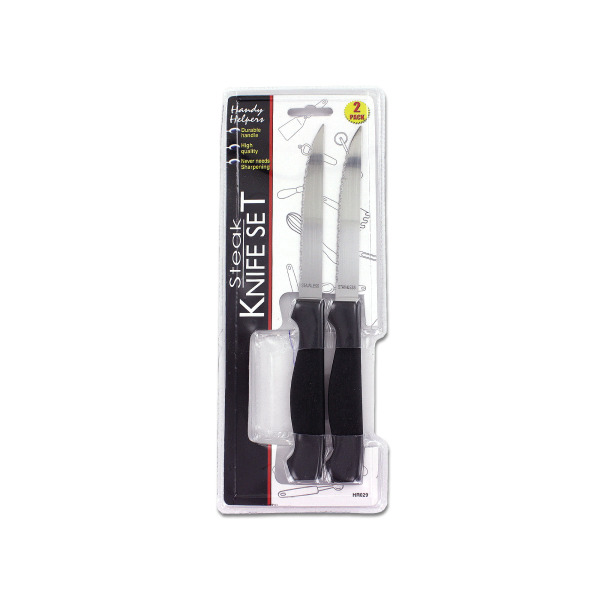 This set includes 2 steak knives. Each knife has a plastic handle with a serrated blade. Handles are ergonomic for comfort. Come packaged in a clam shell with hanging hole. Each knife measure 8 1/2".