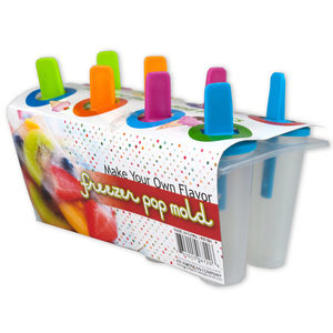 Kids can create their own yummy flavors with this Freezer Pop Mold and easily make delicious spring and summer treats! Also great for parties and picnics. There are 8 molds with 8 colored lid handles. Each mold can make a 3" treat. Handles are 1" long. Comes packaged with a wrap around.,Freezer Pop Mold,Molde Para Helados