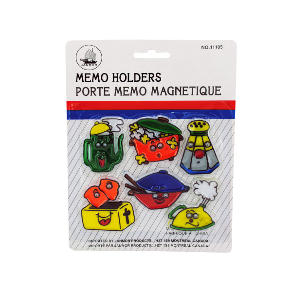 These magnetic memo holders have a bright and kitschy design. There are 6 magnets in styles that include: teapot, popcorn popper, salt shaker, toaster, rice bowl and tea kettle. All magnets have a fun face with wiggly eyes. Magnets are packaged on a blister card with hanging hole.