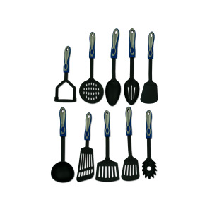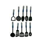 These sharp utensils will make themselves at home in many kitchens, from modern to retro. Selection includes spatulas, slotted spoons and ladles. Each is black with a blue and silver handle. Heavy duty nylon is dishwasher safe.
