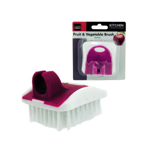 The fruit and vegetable palm brush is made to securely grip your middle finger and curve to the shape of your palm. Brush is made of sturdy plastic and has strong nylon bristle to thoroughly remove excess dirt from fruits and vegetables. Comes packaged on a blister card with hanging hole. Measures 2 1/4" x 2 1/4" and is 1" thick.