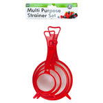 A kitchen essential, this 4-piece Kitchen Strainer Set features white nylon mesh, bowl edge supports and handles designed for hanging. Dimensions are approximately: 10 3/4" x 5 5/8" diameter; 8 3/8" x 4 3/8" diameter; 6 7/8" x 3 1/4" diameter; and 5 3/4" x 2 1/2" diameter. Comes in assorted colors. Comes packaged in a poly bag with a header card.,Kitchen Strainer Set,Coladores 4Pzas