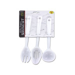 The kitchen serving set comes with 3 essential cooking utensils: serving fork, slotted spoon and serving spoon. Each utensil is small in size and ideal for buffets or potlucks. Set is packaged on a tie card with hanging hole. Utensils measure approximately 8 1/2" long.
