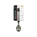 The stainless steel ice cream scoop has an ergonomic handle, is easy to use and is dishwasher safe. Scoop is made with metal with plastic hanging loop for easy storage. Comes packaged on a tie card with hanging hole. Measures 8 1/2" long and the scoop is 1 1/2" x 1 3/4".
