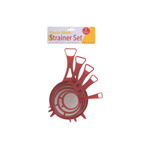This set of fine plastic mesh strainers comes in 5 different sizes and is a great addition to any kitchen. They are perfect for sifting dry ingredients or straining liquid ingredients. The mesh itself is made of plastic. All 5 of the strainers have 2 small hooks on them to let the strainer easily stay on top of almost any kitchen item for convenience. The set comes in a poly bag with a header card. Strainers measure: 6 1/2", 7 1/2", 9", 10" and 11 1/4".