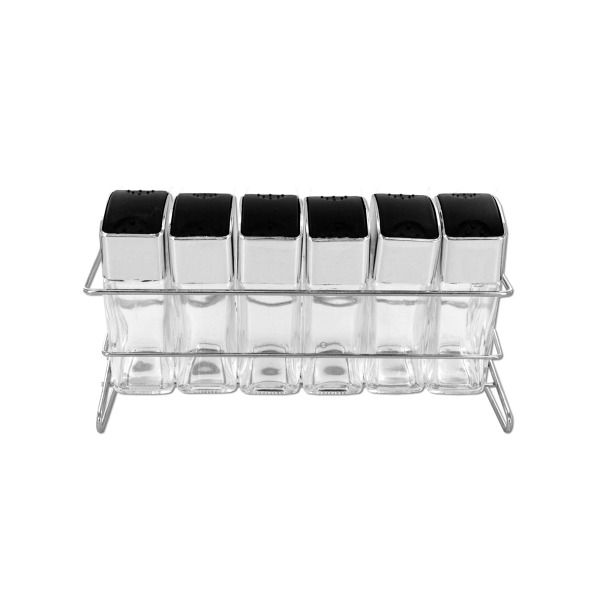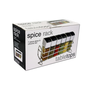 This sleek set will fit nicely into any kitchen decor. Use it for spices, herbs, sugar and other flavorings you might use on a regular basis. Each of the six spice bottles will hold about 1/2 cup. Set includes 6 glass bottles with chrome tops, plastic closures and a chrome rack. Each bottle is 4 1/4" tall, 2" wide and 1 1/4" thick. The entire set is 9 1/4" x 3 1/2".