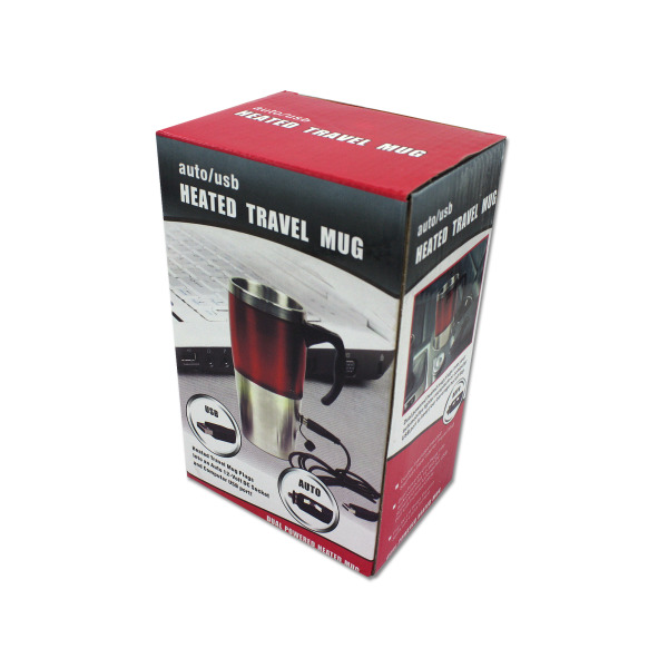 Keep coffee, tea or other hot drinks hot while on the go with this useful mug. Use the USB or auto plug to plug the mug into a computer or car to ensure a hot drink when you need it. Lid locks for security; made from durable stainless steel.