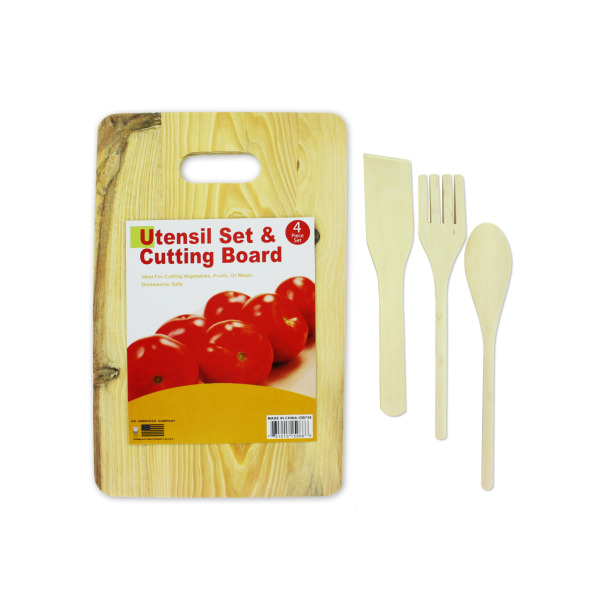 With cutting board and kitchen utensils included, this set makes a great kitchen starter kit or housewarming present. Set includes 1 wooden cutting board and 3 wooden utensils: fork, spatula and spoon. Cutting board has a hole for easy and convenient storage. Comes shrink wrapped with artwork label. Measurements: 8" x 13" cutting board, 10" fork, 9 3/4" spatula and 10" spoon.