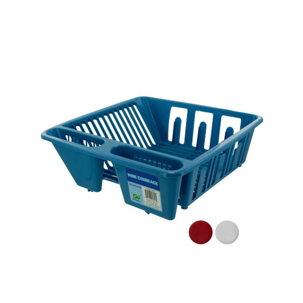 Ideal for studio apartments, dorms or small kitchens; this mini dish rack is the perfect solution to drying and storing dishes. Dish rack is grooved for plates, has slots for cups and contains two storage section for silverware. Comes in assorted colors which may include slate blue, red and white.