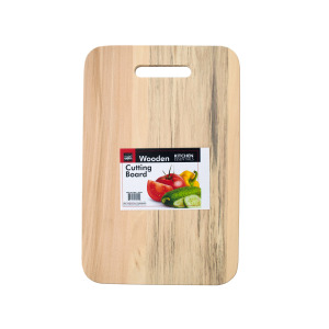 No kitchen is complete without a wood cutting board! Safely cut vegetables, fruit, bread and more without ruining your counters or table. Comes packaged in a shrink wrap with artwork label. Measures approximately 9" x 14".