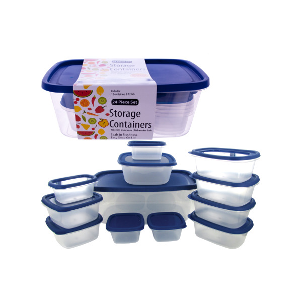 Rectangle storage containers have easy snap-on lids that seal in freshness. Great for neatly storing leftovers, traveling with potluck dishes or for packing lunches. Each set comes with 12 containers with lids. Comes packaged inside one large container with a wrap around label.