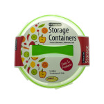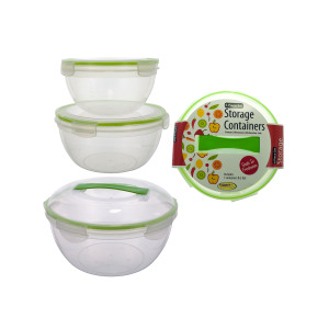 Whether you're storing leftovers or heading over to a potluck, these round storage containers are the perfect companion! Each pack comes with 3 containers: 1 small, 1 medium and 1 large with handle. Set includes snap close lids to seal in freshness. Each bowl has both ounce and milliliter measurements. Containers are freezer, microwave and dishwasher safe. Measurements: 3 3/4" x 7" small bowl, 4 1/4" x 8 1/4" medium bowl and 4 3/4" x 9 1/2" large bowl.