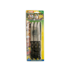 Finished with extreme care by master craftsmen, this Steak Knives Set is a kitchen essential. Made of stainless steel with sturdy, black plastic handles, the knives have excellent strength, hardness and edge durability. Each knife measures approximately 8.5" long and 0.75" wide. Counter top display comes with 100 pieces.