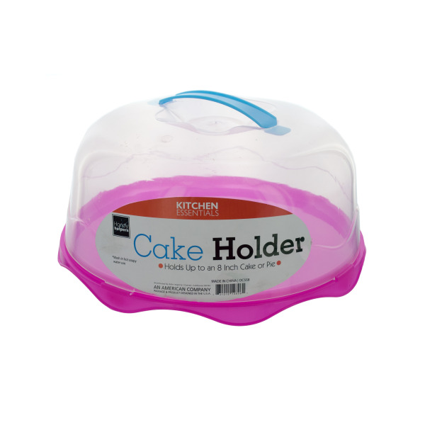 Easily take a cake or pie to a party or picnic in this durable plastic Portable Cake Holder featuring a decorative plastic base with a clear lid that locks to keep baked goods fresh. A handle on top allows you to easily tote it around. Holds up to an 8 inch cake or pie. Comes in assorted color bases and handles. Measures approximately 10" x 10" x 5". Comes loose .,Portable Cake Holder,Porta Torta