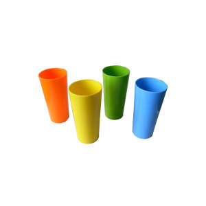 Melamine cups are durable, good looking and last a long time. These are colorful and useful. Each holds about 2 cups of liquid. Colors are assorted and can include orange, yellow, green or blue.