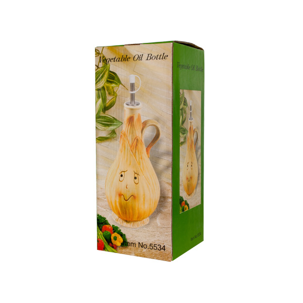 Add some fun garden appeal to your kitchen with this useful Vegetable Oil Bottle made to look like a worried onion. Pour cooking oils into the bottle, seal it with the corked pourer and enjoy drizzling oils in the perfect amount. Attractive bottle is made of strong, white ceramic painted with colorful details and clear-glazed. Bottle without pourer is microwave and dishwasher safe. Comes packaged in an individual box.
