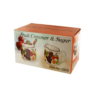 Dress your kitchen up in mouth-watering appeal with this colorful Fruit Creamer and Sugar Set. Includes a creamer pitcher and a sugar jar with a decorative spoon and lid with a grapes knob on top. Microwave and dishwasher safe. Comes packaged in an individual box.