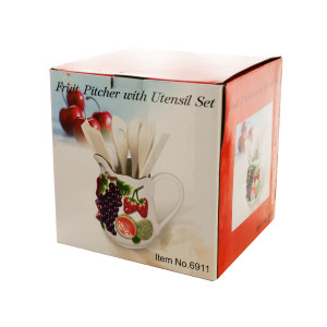 Add some garden fresh style to your kitchen with this attractive Fruit Pitcher and Utensils Set. Decorative ceramic pitcher comes with six various wooden cooking utensils inside. Comes packaged in an individual box.