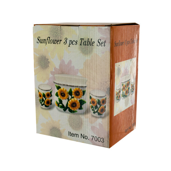 Add some garden appeal to your kitchen with this 3-Piece Sunflower Table Set made of solid ceramic. Looks great on any table. Includes a napkin holder and salt and pepper shakers. Comes packaged in an individual box.