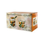 Dress your kitchen up in garden appeal with this pretty Sunflower Creamer and Sugar Set. Includes a creamer pitcher and a sugar jar with a decorative spoon and lid with a little sunflower knob on top. Microwave and dishwasher safe. Comes packaged in an individual box.