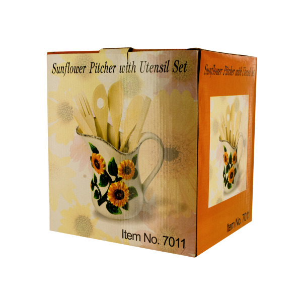 Add some garden style to your kitchen with this pretty Sunflower Pitcher and Utensils Set. Decorative ceramic pitcher comes with six various wooden cooking utensils inside. Comes packaged in an individual box.