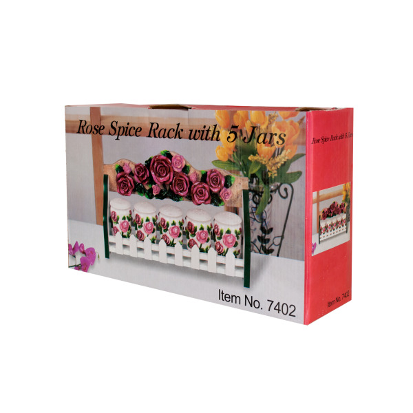 Dress your kitchen up in country garden style with this Rose Spice Rack with Shaker Jars Set. Includes decorative wall-mountable rack and five ceramic shaker jars for spices. Comes packaged in an individual box.
