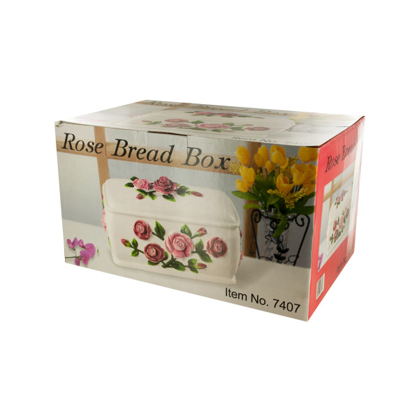 Keep bread fresh in country garden style with this beautiful Rose Bread Box. Made of strong ceramic with ample space for baked goods and a rose-topped lid. Comes packaged in an individual box.
