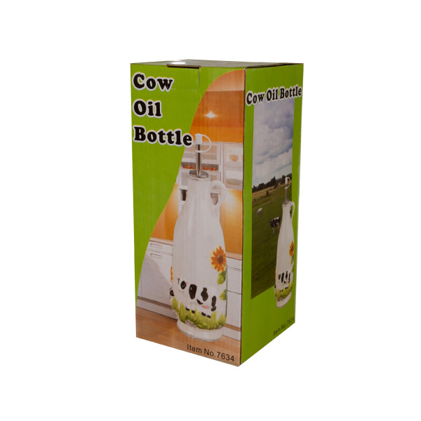 Add some country appeal to your kitchen with this useful Cow Oil Bottle. Pour cooking oils into the bottle, seal it with the corked pourer and enjoy drizzling oils in the perfect amount. Attractive bottle is made of strong, white ceramic painted with colorful details and clear-glazed. Bottle without pourer is microwave and dishwasher safe. Comes packaged in an individual box.