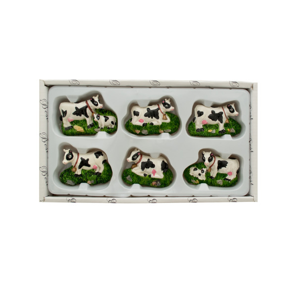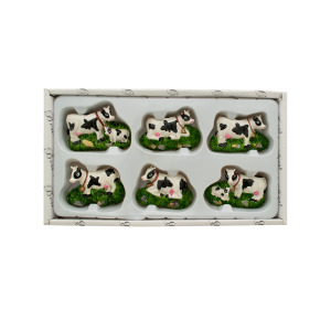 Decorate your refrigerator or other metal surface in country style with this cute 6-Piece Cow Magnets Set. Includes various styles of cows. Each hand-painted cow measures approximately 2.5"-3" with a 0.75" round magnet on back. Comes packaged in an individual window box.
