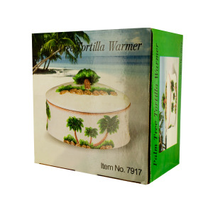 Add tropical appeal to the table with this attractive, hand-painted Palm Tree Tortilla Warmer. Keeps tortillas and other foods warm until they are ready to be used. Made of strong ceramic. Microwave and dishwasher safe. Comes packaged in an individual box.