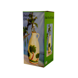 Add some tropical appeal to your kitchen with this useful Palm Tree Oil Bottle. Pour cooking oils into the bottle, seal it with the corked pourer and enjoy drizzling oils in the perfect amount. Attractive bottle is made of strong, white ceramic painted with colorful details and clear-glazed. Bottle without pourer is microwave and dishwasher safe. Comes packaged in an individual box.