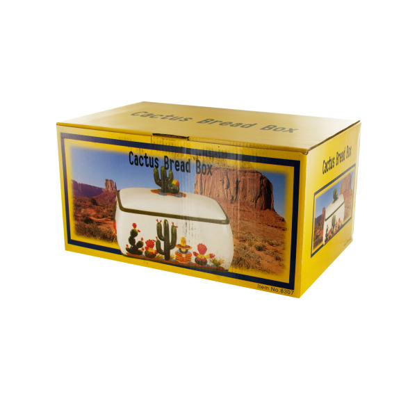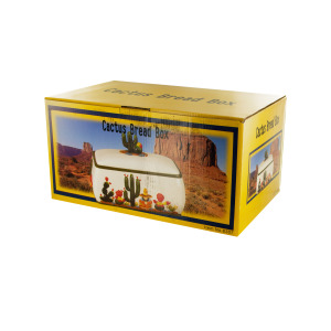 Keep bread fresh in Southwest style with this attractive Cactus Bread Box. Made of strong ceramic with ample space for baked goods and a cactus-topped lid. Comes packaged in an individual box.