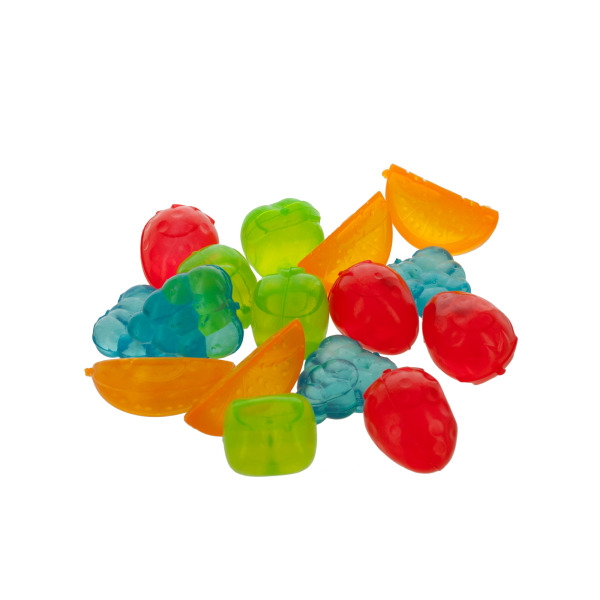 Add some colorful fun to drinks by chilling them with this 16-Piece Plastic Fruit Reusable Ice Cubes Set. Sturdy plastic ice cubes are made in the shapes of apples, strawberries, grapes and orange wedges for a juicy, refreshing look. Each cube measures approximately 1.25"-2". Store in freezer for convenient use any time. Hand wash with soap and warm water. Comes packaged in a net bag with a UPC tag.