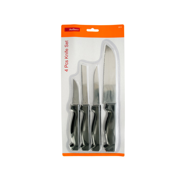 A great set to have in the kitchen, this 4-piece Stainless Steel Knife Set has a variety of knives for all your cutting needs. Includes a 6.25" paring knife, small 7.5" bread knife, 7.5" steak knife and 9.5" chopping knife. All have serrated stainless steel blades and black plastic handles. Comes packaged in a blister pack.