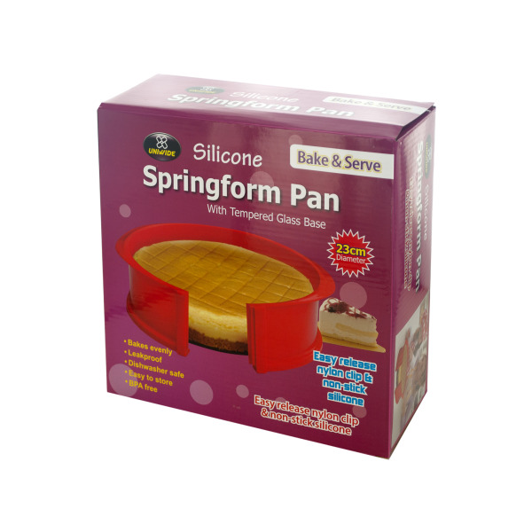 Bake and serve cakes easily with this Silicone Springform Pan with Tempered Glass Base featuring non-stick silicone and an easy release nylon clip. Bakes evenly, is leakproof, dishwasher safe and easy to store. BPA free. Measures approximately 9" in diameter. Comes packaged in an individual box.