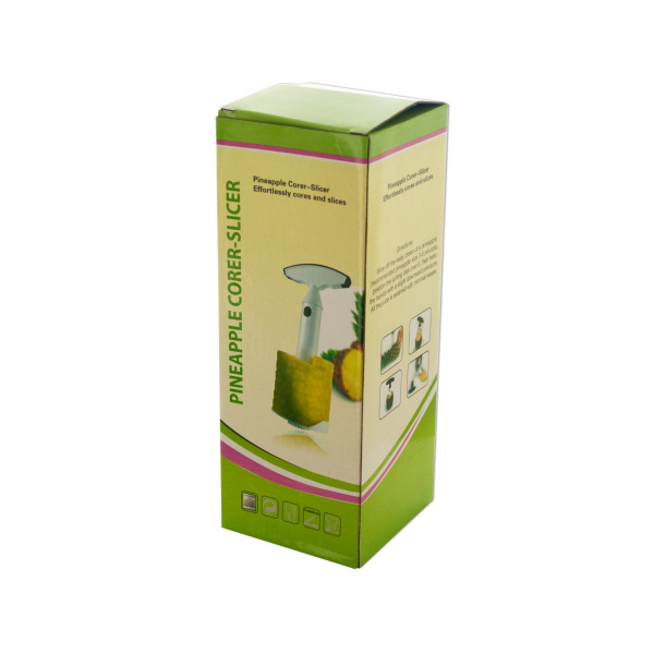 Effortlessly core and slice pineapples with this convenient Pineapple Corer-Slicer. Simply slice off the leafy crown of a pineapple, position the cutting disk over it, then twist the handle with a slight downward pressure. All the juice is retained with minimal waste. Measures approximately 9" x 4.75". Comes packaged in an individual box.